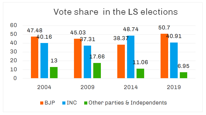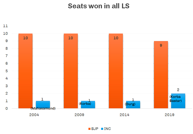 Interestingly, in all the Lok Sabha elections held in the State since 2004 (Chhattisgarh was carved out of Madhya Pradesh in 2000), BJP has won the largest numbers of seats – 10 out of 11. It is only in the 2019 Lok Sabha election that Congress won two seats. In fact, the BJP has consistently held the four Adivasi seats, except in 2019 when Congress wrested the Bastar seat. The Congress held Korba seat in 2009 and 2019, additionally winning the Bastar seat in 2019.
