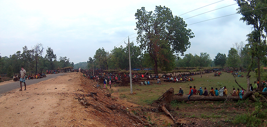 Village youth gathered to protest against wide roads and security camp in Pusnar, Bijapur district (2021)