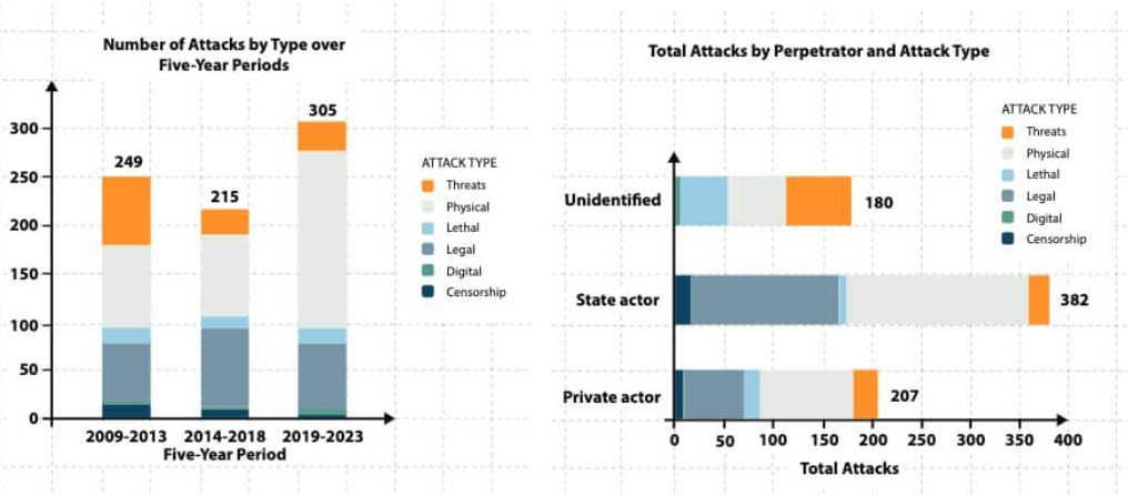 Type of attack to environmental journalists and media outlets (left) and perpetrators (right). Image: UNESCO (2024).
