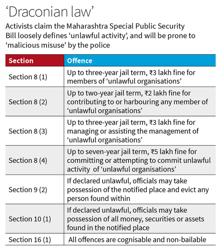 PUCL Maharashtra said that similar legislation passed by the state of Chhattisgarh, and Jammu and Kashmir has received extensive criticism for being used to target journalists, lawyers, environmental defenders, citizen activists and adivasi protestors who have dissented against state action. It said the present move of the Maharashtra government and its timing seems to be aimed not at dealing with violent or terrorist activities; but in reality to suppress political opponents, public protests, people’s movements, and civil society and human rights activists, journalists and lawyers.