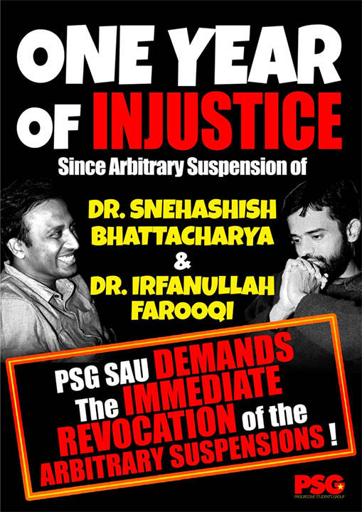 The Progressive Students Group (PSG) at the South Asian University (SAU), Delhi, has demanded immediate revocation of the arbitrary suspensions of two faculty membersSnehashish Bhattacharya (Faculty of Economics) and Irfanullah Farooqi (Faculty of Social Sciences) by the administration.