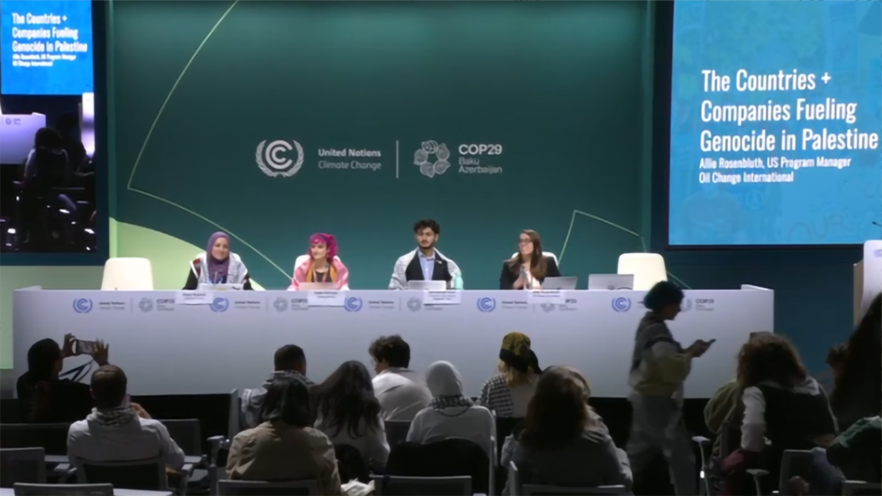 On 14 November, the fourth day of the United Nations Climate Change Conference, or COP29, in Azerbaijan, green groups highlighted how fossil fuel companies “enable and profit from Israel’s genocide in Gaza,” continuing “a long history of the industry’s complicity in mass atrocities worldwide.” Speaking at COP29, they highlighted how multiple systems of oppression converge to perpetuate violence against communities in Palestine.