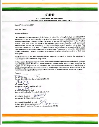 A group of prominent Indian Muslims, in an open letter to Muhammad Yunus, has strongly condemned the mistreatment of the minorities and urged the Bangladesh authorities to take immediate and corrective actions.