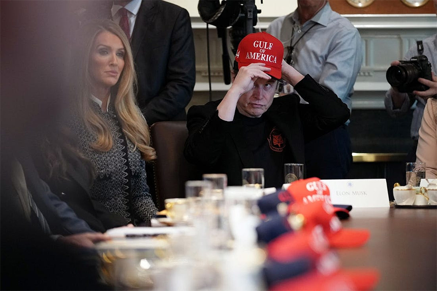 Tesla CEO Elon Musk puts on a second hat that reads “Gulf of America” during a Cabinet meeting at the White House on April 30, 2025 in Washington, DC. (Photo by Andrew Harnik/Getty Images)