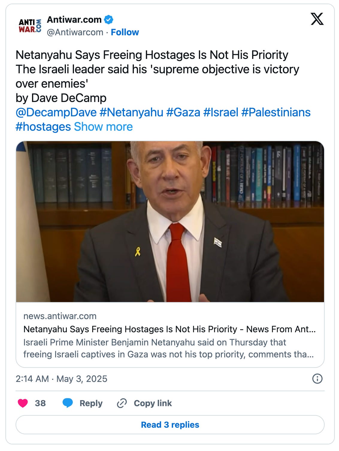 So they’ve made this perfectly clear. This isn’t about Hamas, except insofar as an armed resistance group will make it difficult to forcibly remove all Palestinians from Gaza. And it certainly isn’t about hostages.