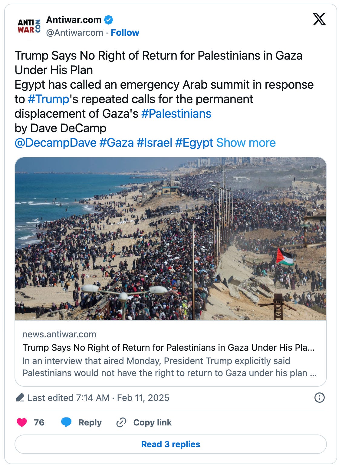 Israel has been seeking ways to purge Gaza of Palestinians for generations. That’s all this has ever been about. Not October 7. Not hostages. Not Hamas. Not terrorism. Everything about Israel’s operations in Gaza have indicated that their real goal is to remove Palestinians from a Palestinian territory and not to free hostages or defeat Hamas. And then when Trump took office, they started openly admitting it.