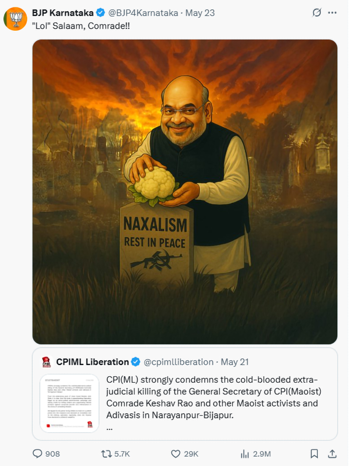 On May 23, two days after security forces killed several Maoists in Chhattisgarh, the X handle of BJP Karnataka (@BJP4Karnataka) posted an animated image of Union home minister Amit Shah with a cauliflower in his hand, resting his arm on a tombstone that said, “Naxalism Rest in Peace”. (Archive). The image was captioned, “Lol” Salam, Comrade,” a pun on communists’ usage of the greeting “Lal Salam” or red salute.