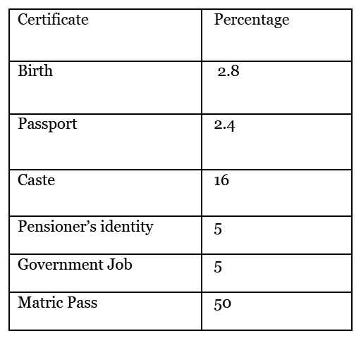 As birth certificates are among eleven key documents listed for inclusion in the electoral roll of Bihar, the Civil Registration System (CRS) reports of the past two decades show that Bihar has been lagging far behind the rest of the country in registering births. As per the National Family Health Survey-3, only 2.8% of Bihar’s population born between 2001 and 2005 possess a birth certificate. Only 2.4% of Bihar’s population possess a passport. According to National Family Health Survey-2 and National Family Health Survey-5, around 45-50% of 18-40-year-olds are matriculate. Only 5% are in government jobs, and 16 % possess caste certificates.