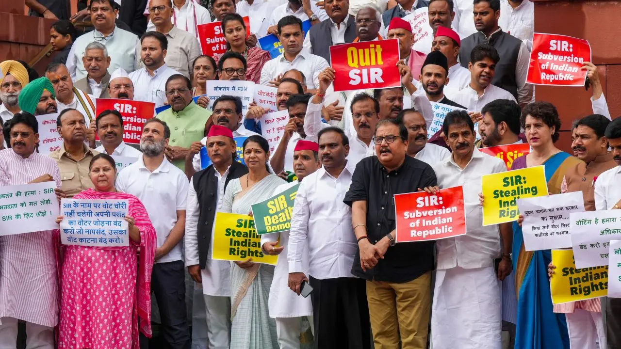 Feature Image: Opposition MPs protest at the Parliament’s gate over the issue of Special Intensive Revision (SIR) of Electoral Rolls in Bihar, July 2025.