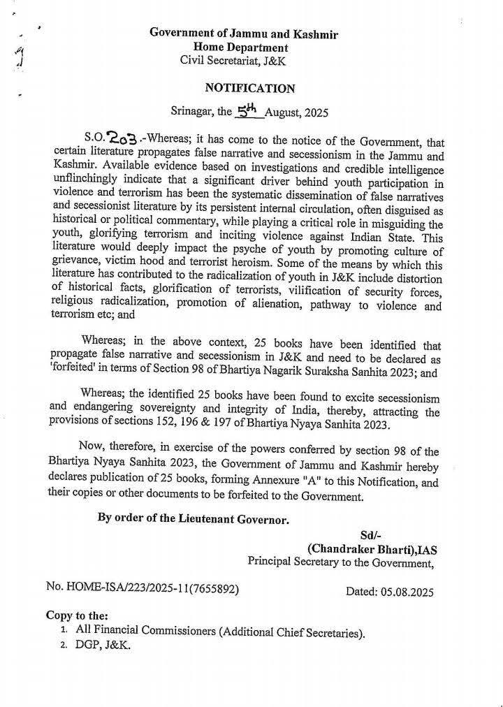 A notification issued by the Home Department on Tuesday said, “Available evidence based on investigations and credible intelligence unflinchingly indicate that a significant driver behind youth participation in violence and terrorism has been the systematic dissemination of false narratives and secessionist literature.” It alleged that the identified books have played a “critical role” in “misguiding the youth, glorifying terrorism and inciting violence against the Indian State.”