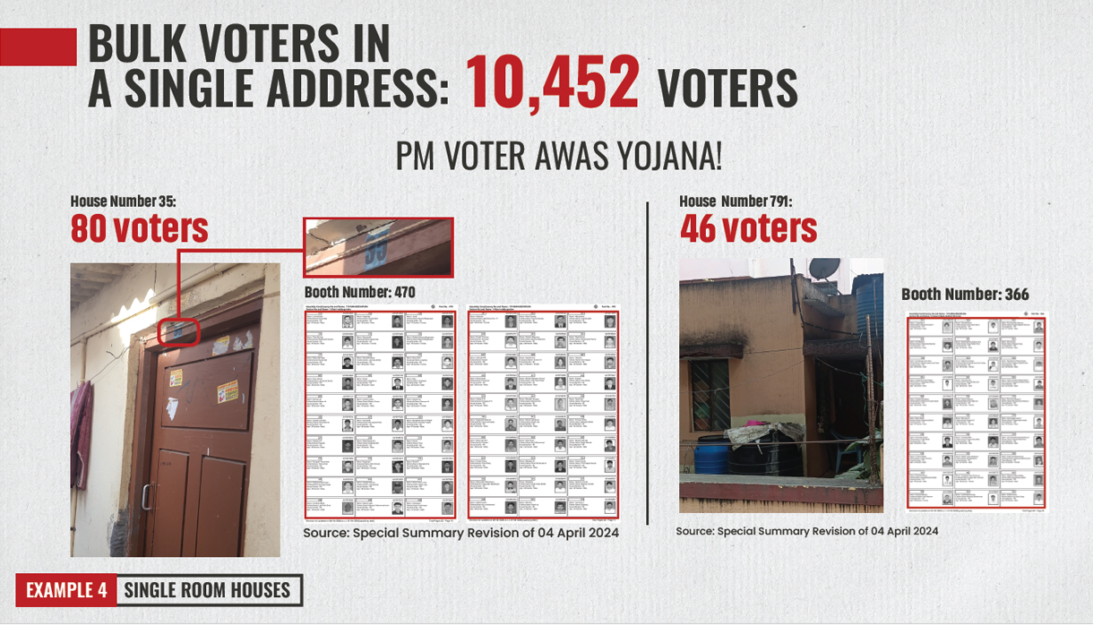 He highlighted the existence of “bulk voters” with the same address. He showed a photograph of a brewery whose address was cited by 68 voters. Showing the photograph of a house no 35, he alleged that it is a single-room house where 80 voters are shown living with different names, different families. In another house, 46 voters all from different families were found living in a single bedroom house, he said.