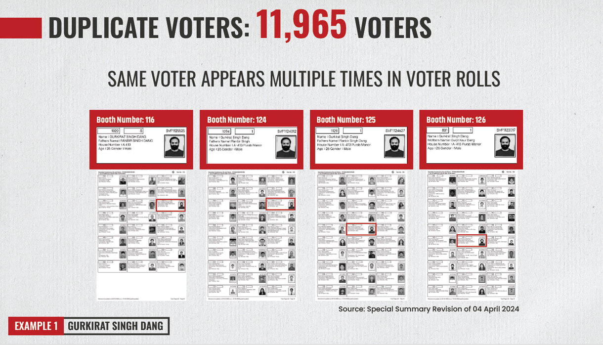 Rahul Gandhi cited the example of a person whom he identified as Gurkirat Singh Dang, whose name figured in voter lists in four different polling booths in Mahadevpura. “There are thousands of such voters who have voted multiple times in different states. A total of 11,965 votes have been stolen like this,” he said.