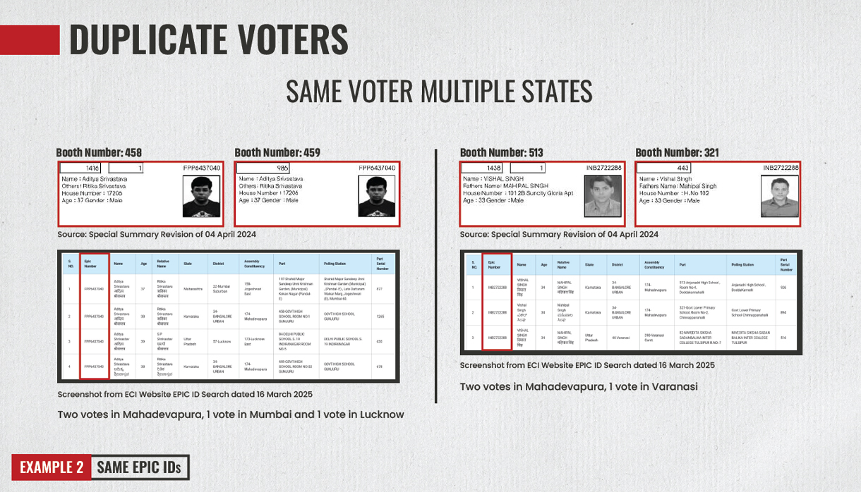 He showed the photograph of another person whom he identified as Adtiya Srivastava, and claimed the person was enrolled as a voter in two polling booths in Karnataka and one each in Uttar Pradesh and Maharashtra.