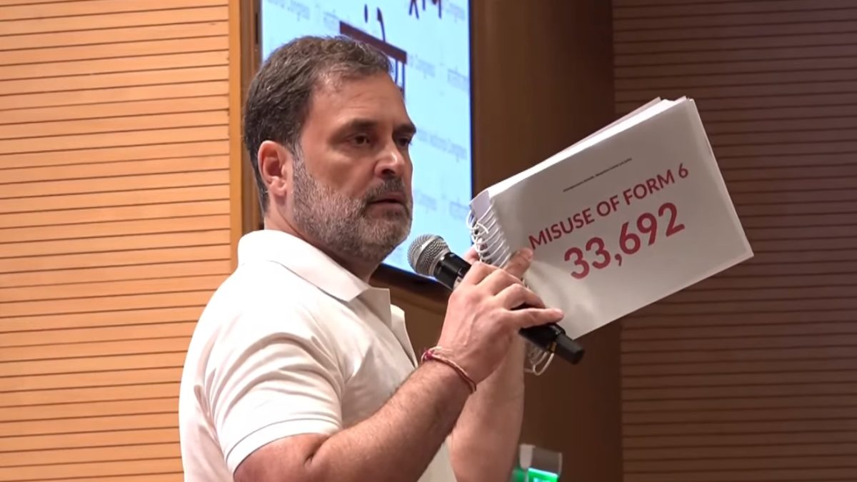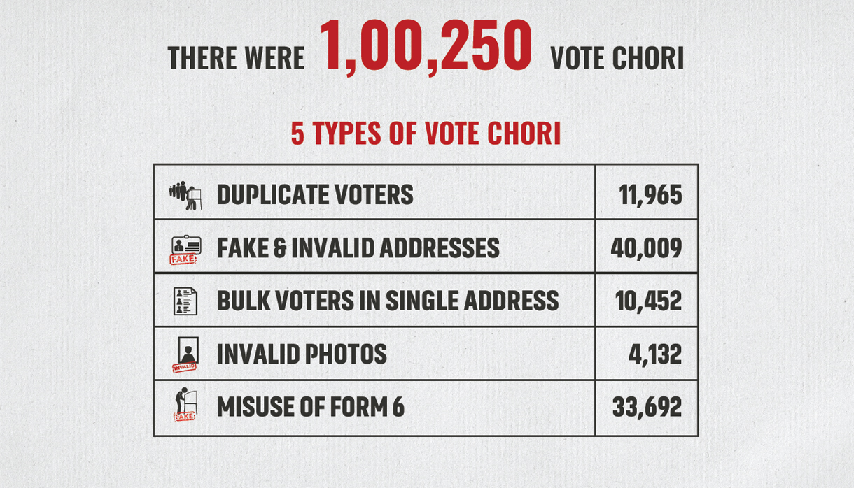Addressing a press conference at the All India Congress Committee (AICC) headquarters, Rahul Gandhi demonstrated before the media, ways in which the election to the Bangalore Central seat was stolen. He alleged that out of 6.5 lakh total votes in the Mahadevapura Assembly, 1,00,250 votes were stolen in five different ways: duplicate voters, fake and invalid addresses, bulk voters in a single address, invalid photos, and misuse of Form 6 given to first-time voters for enrolment.” This manipulation of the electoral rolls, he alleged, led the saffron party to win the Bengaluru Central seat.