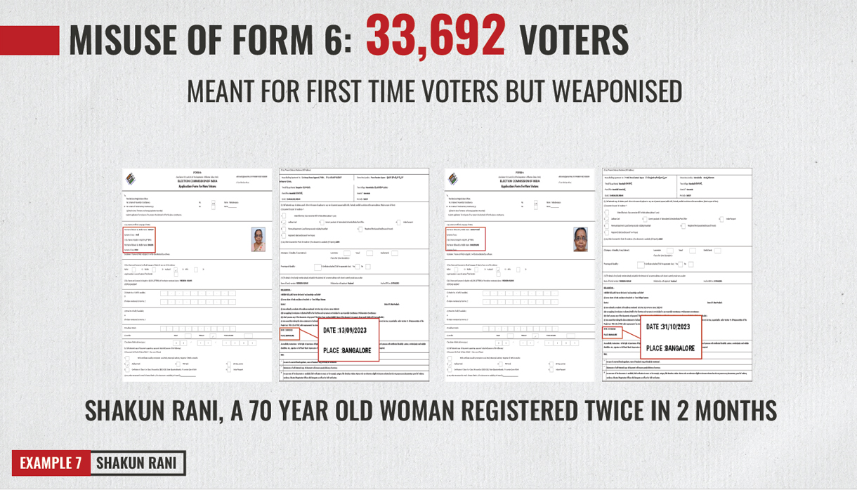 Regarding the alleged misuse of Form 6, given to first-time voters for enrolment, Rahul Gandhi cited the example of a 70-year-old  lady called Shakun Rani, who got registered as a new voter twice in two months, and she cast her votes twice in two different booths. Rahul alleged that they found 33,692 such enrollment of new voters but they are all old.