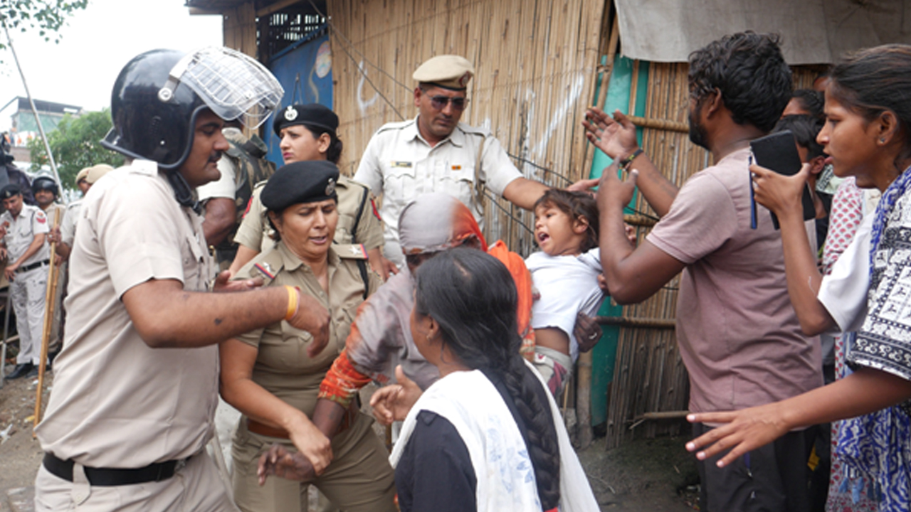 Feature Image: Police personnel clash with residents of Premnagar as families resist the demolition of their homes. A young child screams in the arms of the woman carrying her as they are physically dragged out by female police personnel. October 2025/MOULI SHARMA