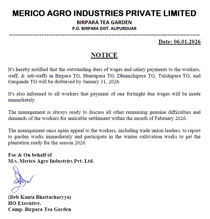The December 29 dharna was temporarily lifted around 11 pm after intervention by Labour Minister Moloy Ghatak, who announced that a tripartite meeting between workers, management, and the labour department would be held to the resolve the issues. The minister assured that Merico would be compelled to present a schedule for clearing all wage arrears by February 2026. He also assured workers of initiating legal action under the Payment of Wages Act, including possible cancellation of garden ownership, if the company failed to comply.
