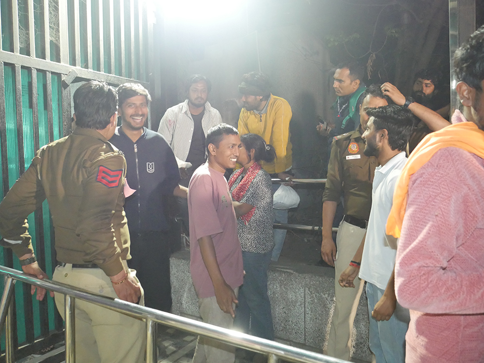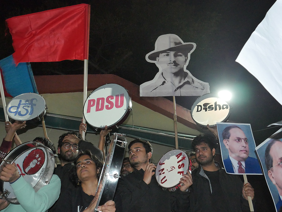 Ahead of the students’ march, the Delhi Police turned the JNU campus area into an emergency security zone, barricading and locking university gates and virtually imprisoning students within their institute. Five layers of barricades were erected outside the JNU main gate, and Rapid Action Force personnel, anti-riot vehicles, and detention buses were stationed there. This demonstrated the premeditated nature of the police repression and mass detentions that followed, when students broke down the locks and pushed past the barricades to resist the confinement.