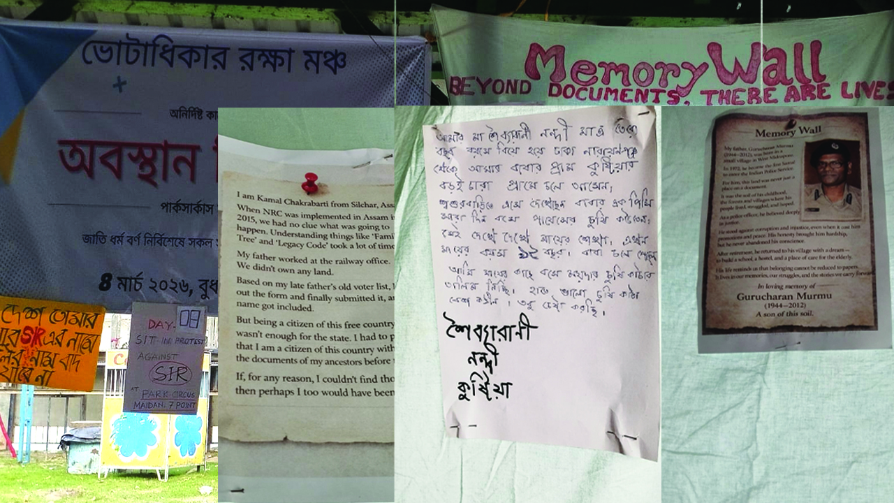 গত চার মার্চ থেকে ভোটাধিকার রক্ষা মঞ্চ থেকে কলকাতার পার্ক সার্কাস ময়দানে চলছে এসআইআর বিরোধী গণ অবস্থান। শুধুমাত্র মঞ্চের সদস্যরাই নন, এখানে আসছেন সমমনস্ক সহ-নাগরিকেরা। গড়ে তুলছেন প্রতিরোধ। দিন-রাত ব্যাপী এই অবস্থানে প্রতিদিন নেওয়া হচ্ছে বিশেষ কর্মসূচী। তার মধ্যে অন্যতম স্মৃতির দেওয়াল – ‘মেমোরি ওয়াল, বিয়ন্ড ডকুমেন্টস দেয়ার আর লাইভস’। এ যেন সিএএ-এনআরসি বিরোধী ‘হাম কাগজ নেহি দিখায়েঙ্গে’-রই আরেক রূপ। রাষ্ট্র যত নির্দিষ্ট কাগজে বেঁধে ফেলতে চায় মানুষের নাগরিক হওয়ার অধিকার, ততই স্মৃতিতে জেগে ওঠে দেশের, পরিবারের, সমাজ-প্রতিবেশীর, বন্ধুর আখ্যান, যার মধ্যে জেগে থাকে নাগরিক হওয়ার অধিকারের যাবতীয় প্রমাণ। এই দেওয়াল তাই তৈরি হয়েছে নাগরিকদের নিজেদের স্মৃতি রোমন্থনের জন্য, যে স্মৃতিই ইতিহাস, যে স্মৃতিই প্রতিরোধ।