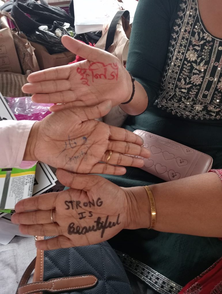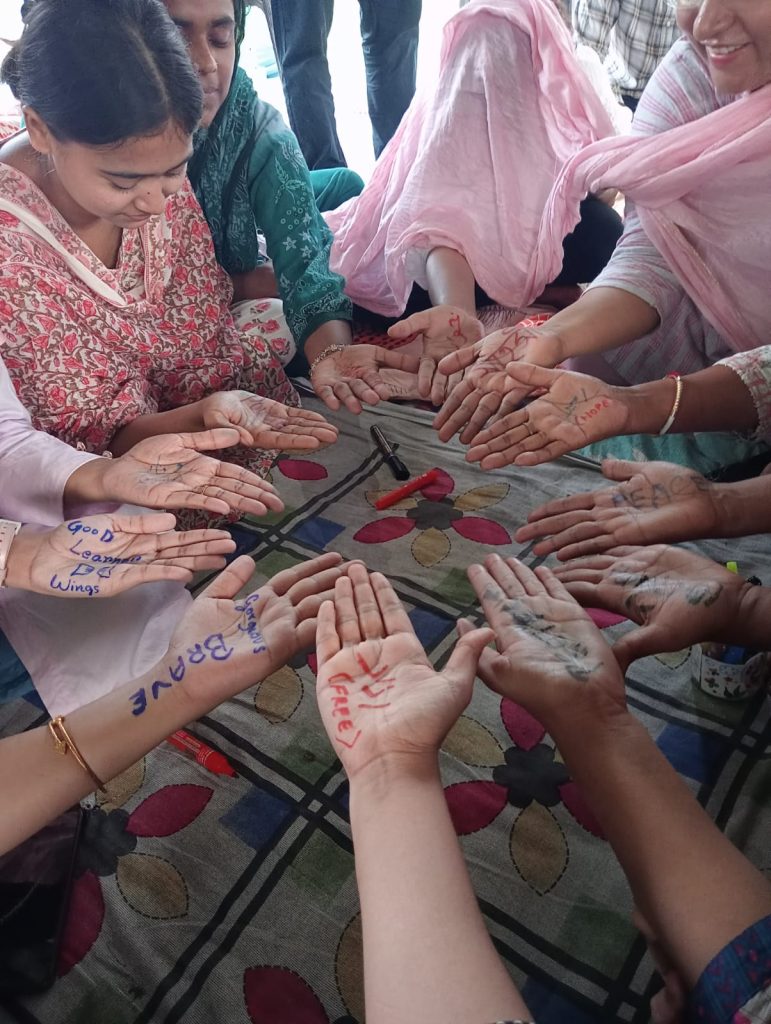 As the clock struck three in the afternoon, women slowly but steadily formed a circle with markers and sketch pens in their hands. They saw each other, looked into each other’s eyes, thought for a few seconds and began writing on each other’s hands. Once everyone had finished writing, they held out their hands to show others what was written.