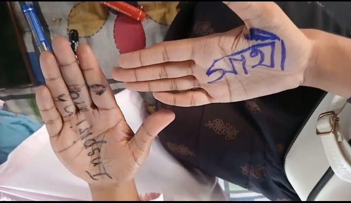 Meghomala showing her palm adorned with the word AWAZ or VOICE