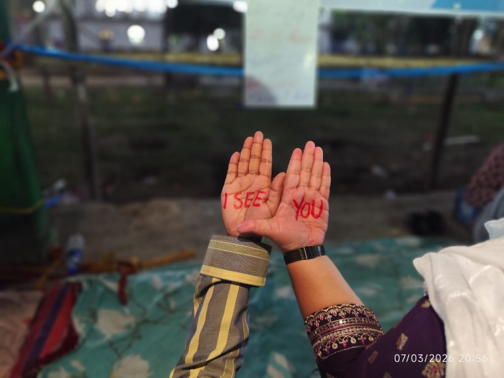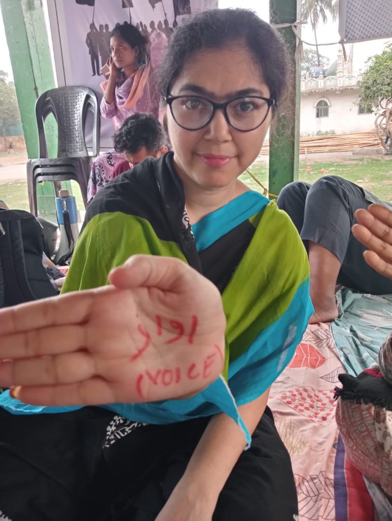 Meghomala is one among those women. She comes to the protest almost daily, solely in solidarity. Her name has been cleared by the ECI. But she keeps coming and coming back to the protest site, and she sits there patiently, raising slogans against SIR and for the unity of the people – “Awaz do… Hum Ek Hai”. AWAZ or VOICE is also written on her palm. When asked why she is here, she responds quickly and confidently, with no strain of hesitation in her voice, “the current regime at the Centre, with the help of the Election Commission, is attempting to silence us. I am here to not let that happen. It does not matter that my name is not deleted or disputed. I have come for others. So that tomorrow when I am pulled up by the State, they can come to my aid.”