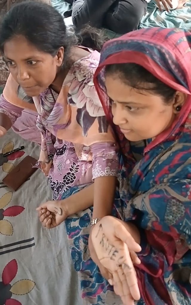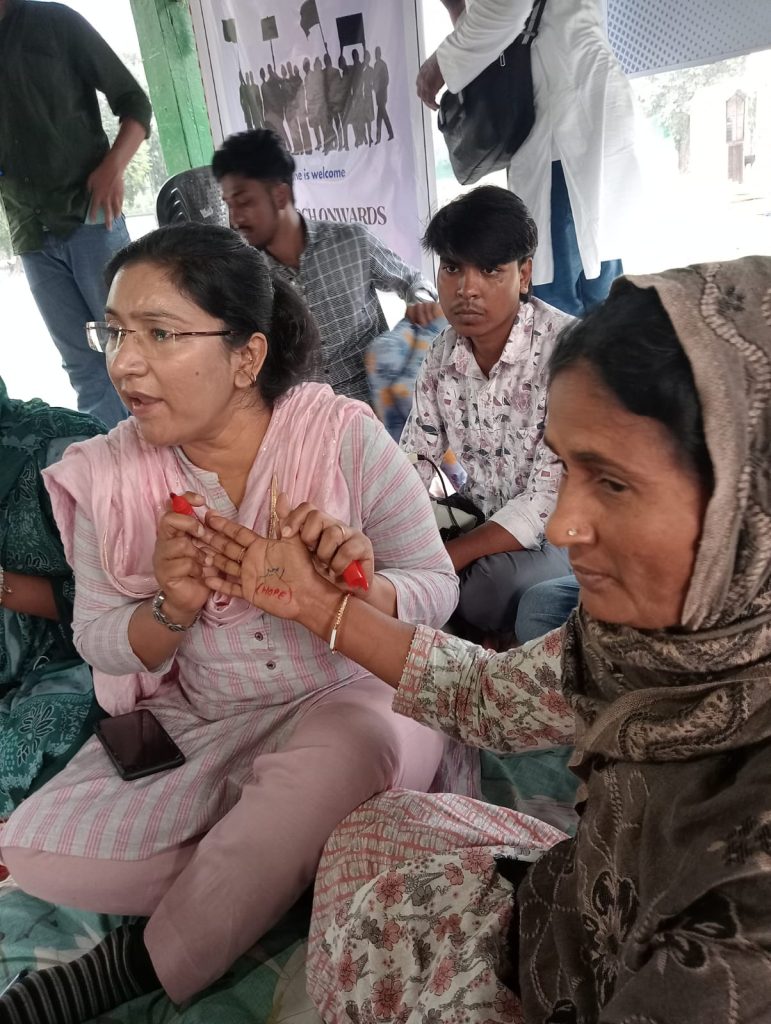 Dr. Nousheen Baba Khan, an activist and social worker involved in the movement against NRC back then and against SIR, wrote HOPE or UMEED on her partner Anwari ji’s palm. Nousheen explained her choice of word by drawing attention to how traditionally women have been associated with hope – they are the source of a new generation, they carry in their wombs the hope of the future. But Nousheen rejected this traditional lens of viewing women. She emphasized that her partner in the activity, as also every woman, brings her hope by rising above the labels. She stated that women have been the strongest pillar of society and they are the ones who can usher in a new future – not as a mother through their children, but as themselves through struggle and perseverance. She lamented the belief that men have undisputed authority on the bodies of marginalized women and also the fact that the state has been attacking the bodies of women with various weapons, be it CAA, the hijab ban, moral policing, casteist atrocities and now SIR. When women, who have been reduced to just their body, or to an object, or to their names, or to labels, rise up and demand to be seen, it gives immense hope to all of us.