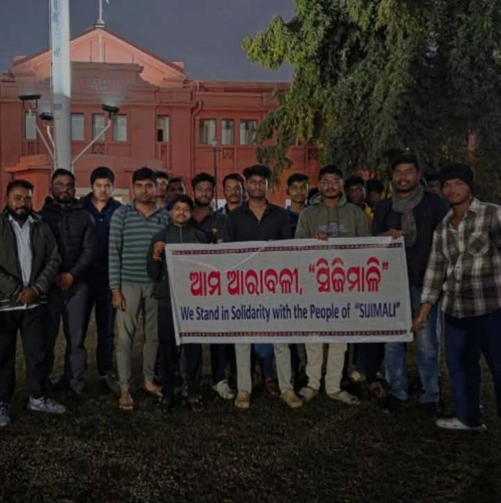 Two spontaneous protests in solidarity with the struggle against bauxite mining took place on January 12 and 13, respectively, at Sambalpur University and at Ravenshaw University. These protests condemning the incarceration of Adivasis and Dalits and the growing police repression in the region also upheld people’s right to protect their Fifth Schedule areas and say NO to bauxite mining. The placard at Ravenshaw University said “Our Aravali: Sijimali!! We stand in solidarity with the people of Sijimali.”